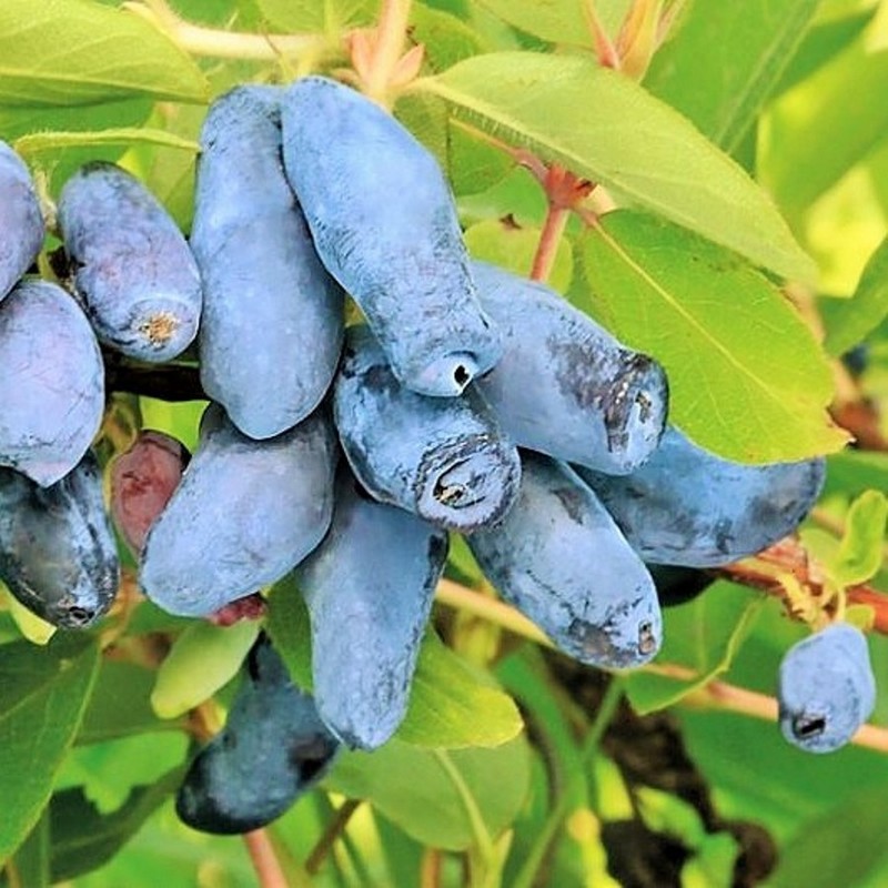 Жимолость «Огненный Опал» - среднерослый кустарник с плотной кроной и пряморастущими побегами, покрытыми ярко-зелёными удлинёнными листьями, которые создают выразительный фон для декоративных и полезных ягод. Плоды достаточно крупные, чуть вытянутой формы, сине-фиолетового оттенка и нежным восковым налётом, создающим эффект мерцания на солнце. Вкус ягод сладковатый, с тонкой пряной кислинкой и лёгким ароматом полевых трав. Созревают они рано, в первой декаде июня.