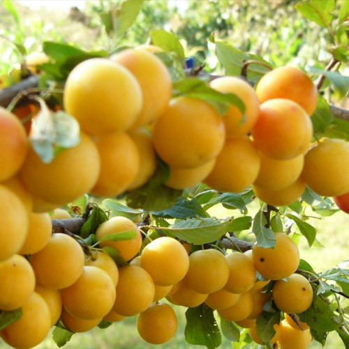 Плоды – сливы, среднего размера. Масса плодов от 35 до 40 граммов. Имеют желтую окраску с бархатистыми волосками на поверхности. Мякоть очень сочная, сладкая. Плодоносить алыча начинает спустя 4-5 лет после прививки саженца, с одного дерева собирают до двадцати килограммов слив. Сливы созревают в конце июня – начале или середине июля. Растение самобесплодно, то есть требует рядом опылителя. Им может выступать любой другой сорт алычи со схожими сроками цветения.