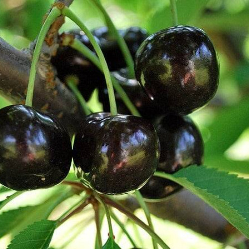 Ягоды черешни имеют тёмно-бордовый, почти чёрный цвет, округлую форму и крупный