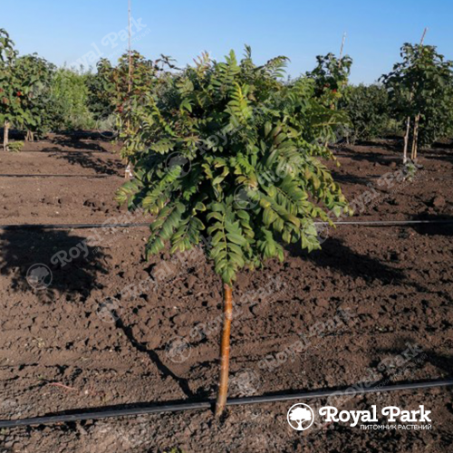 Рябина Глобозум - декоративная форма рябины обыкновенной, отличающаяся идеально округлой кроной. В отличие от многих других сортов, рябина Глобозум чаще выращивается на штамбе, достигает от 3 до 5 м в высоту и имеет диаметр кроны около 2-3 м, что делает ее удобной для компактных участков и регулярных посадок. Главное достоинство данного сорта - компактная, плотная, практически шаровидная форма кроны, которая формируется без дополнительной обрезки и сохраняет симметрию на протяжении многих лет. Листья непарноперистые, насыщенного зеленого оттенка летом, а осенью окрашиваются в яркие желто-оранжевые тона. Цветение наступает в конце мая - начале июня, когда дерево покрывается многочисленными белыми щитковидными соцветиями, на месте которых к концу лета формируются яркие оранжево-красные ягоды.