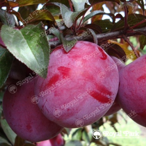 Слива «Голливуд» - это яркий представитель декоративно-плодовых культур, сочетающий в себе привлекательный внешний вид и высокие вкусовые качества плодов. Дерево средней высоты, до 3-4 м, с компактной округлой кроной и густой листвой. Одной из главных декоративных особенностей является насыщенно-красная, почти бордовая окраска листьев, сохраняющаяся с весны до осени. Весной слива обильно цветет бело-розовыми цветами, а в середине лета на ней созревают крупные округлые плоды темно-бордового цвета с сочной янтарно-желтой мякотью. Вкус слив сладкий с легкой кислинкой, а текстура плотная, что делает их идеальными как для свежего употребления, так и для переработки.