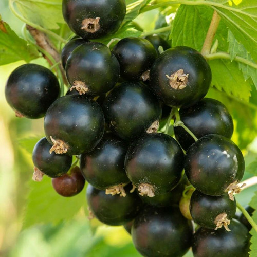 Смородина черная «Нюрсинка» – перспективный раннеспелый сорт черной смородины, который ценится за крупноплодность, высокую урожайность и повышенную устойчивость к неблагоприятным факторам среды. Это среднерослый кустарник, достигающий высоты 1,2–1,5 м, с полураскидистой, хорошо облиственной кроной диаметром до 1,2 м. Ягоды очень крупные (средняя масса 2,1–3 г, отдельные – до 4 г), округлые, чёрные, с сильным глянцевым блеском и тонкой, но плотной кожицей. Мякоть нежная, ароматная, с гармоничным десертным вкусом, в котором удачно сочетаются сахаристость и легкая освежающая кислинка.