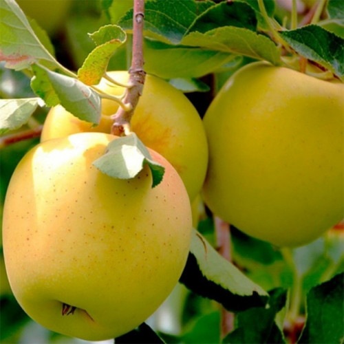 Яблоня «Голден Делишес» - это один из самых известных сортов в мире. Дерево средней высоты, с раскидистой, округлой кроной. Листья тёмно-зелёные, овальные, с заострёнными концами и гладкими краями. Плоды имеют округлую или слегка коническую форму и окрашены в золотисто-жёлтый цвет, иногда с розоватым румянцем на солнечной стороне. Кожица тонкая, гладкая и блестящая, а мякоть плодов светло-кремовая, сочная, хрустящая, с характерным сладким вкусом и лёгким пряным ароматом. Эти яблоки известны своим гармоничным вкусом без выраженной кислинки, что делает их популярными для употребления в свежем виде, приготовления соков и десертов. Плоды созревают в конце сентября - начале октября и хорошо хранятся до весны при правильных условиях хранения.