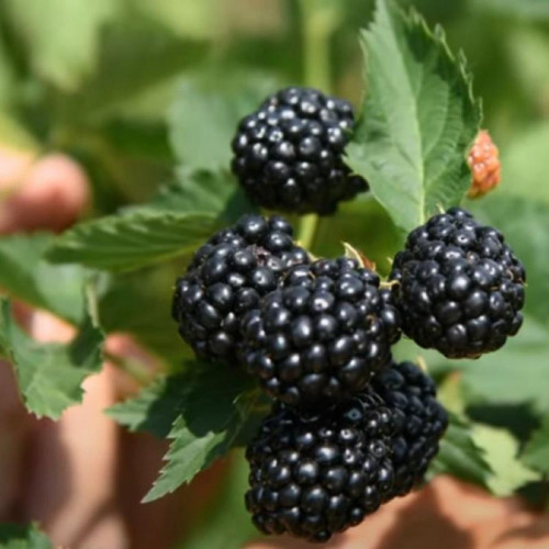 Ежевика «Кадо» – популярный бесшипный сорт ежевики, который высоко ценится за рекордную крупноплодность, превосходный вкус ягод и высокую продуктивность. Это мощный, энергичнорастущий кустарник с полустелющимися побегами, достигающий во взрослом состоянии высоты 2-2,5 м при длине плетей 3-4 м. Побеги полностью лишены шипов, что значительно упрощает уход и сбор урожая. Ягоды очень крупные (массой 7-9 г), удлиненно-конической формы, с глянцевой черной кожицей и плотной, но сочной мякотью. Вкус насыщенный, сладкий, с богатым ежевичным ароматом и легкой освежающей кислинкой.