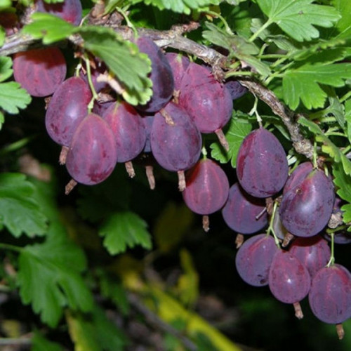 Крыжовник «Черносливовый» - это уникальный сорт, отличающийся тёмной окраской плодов и приятным вкусом, напоминающим чернослив. Куст крыжовника средней высоты, раскидистый и густой, с крепкими прямостоячими побегами. Шипы редкие и мягкие, что упрощает уход за растением и сбор урожая. Листья крупные, насыщенного зелёного цвета, с характерной морщинистой поверхностью. Плоды крупные, весом до 5-7 гр, имеют округло-овальную форму. Кожица плотная, гладкая, насыщенного тёмно-фиолетового, почти чёрного цвета, с лёгким восковым налётом. Вкус ягод сладкий, с едва уловимой кислинкой и оригинальными черносливовыми нотками. Благодаря своей плотности плоды отлично подходят для транспортировки и хранения. Ягоды универсальны в использовании: их можно употреблять в свежем виде, использовать для приготовления джемов, варенья, компотов и сушить для получения черносливоподобной закуски. Урожай созревает во второй половине июля, а сбор рекомендуется проводить в несколько этапов, чтобы ягоды не осыпались.