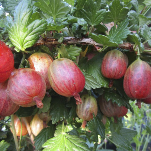 Крыжовник «Тиксия» – популярный среднепоздний сорт крыжовника, который высоко ценится за исключительно крупные ягоды и превосходные вкусовые качества. Это сильнорослый кустарник, достигающий во взрослом состоянии высоты 1,2-1,5 м при диаметре кроны 1-1,2 м, формируя умеренно раскидистую, компактную форму. Побеги практически бесшипные, что значительно облегчает уход и сбор урожая. Ягоды очень крупные (массой 7-9 г, отдельные до 13-15 г), округло-овальной формы, при полном созревании приобретают насыщенную ярко-красную окраску с легким восковым налетом. Мякоть сочная, нежная, сладкая с легкой освежающей кислотностью, десертного вкуса.