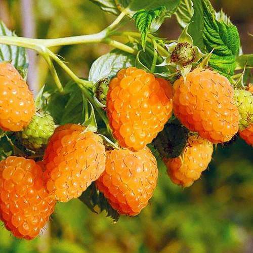Малина «Золотые купола» - это ремонтантный сорт, который привлекает внимание своими крупными, ярко-жёлтыми ягодами и высокой урожайностью. Кусты малины среднерослые, достигают 1,5-1,8 м в высоту. Побеги у этого сорта прямостоячие, мощные, с небольшим количеством шипов, что облегчает уход за растением и сбор урожая. Листья крупные, тёмно-зелёные, слегка гофрированные. Плоды крупные, весом до 5-8 гр, округло-конической формы. Ягоды имеют ярко-жёлтый цвет, с лёгким золотистым оттенком. Вкус ягод сладкий, с нежной кислинкой и приятным ароматом. Мякоть ягод плотная, что позволяет им хорошо переносить транспортировку. Этот сорт подходит как для свежего потребления, так и для переработки: варенья, джемов, компотов, а также для заморозки.
