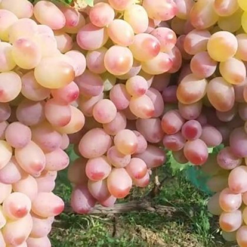 Плоды винограда собраны в большие плотные гроздья весом около 800-1000 граммов. Ягоды крупные, овальные или слегка вытянутые, с насыщенной розово-красной окраской и лёгким восковым налётом. Вкус ягод очень сладкий с яркими фруктовыми нотками. Мякоть плотная, сочная и ароматная. Кожица тонкая и прочная, что защищает плоды от повреждений и позволяет перевозить их без риска растрескивания. Плоды созревают в середине августа.